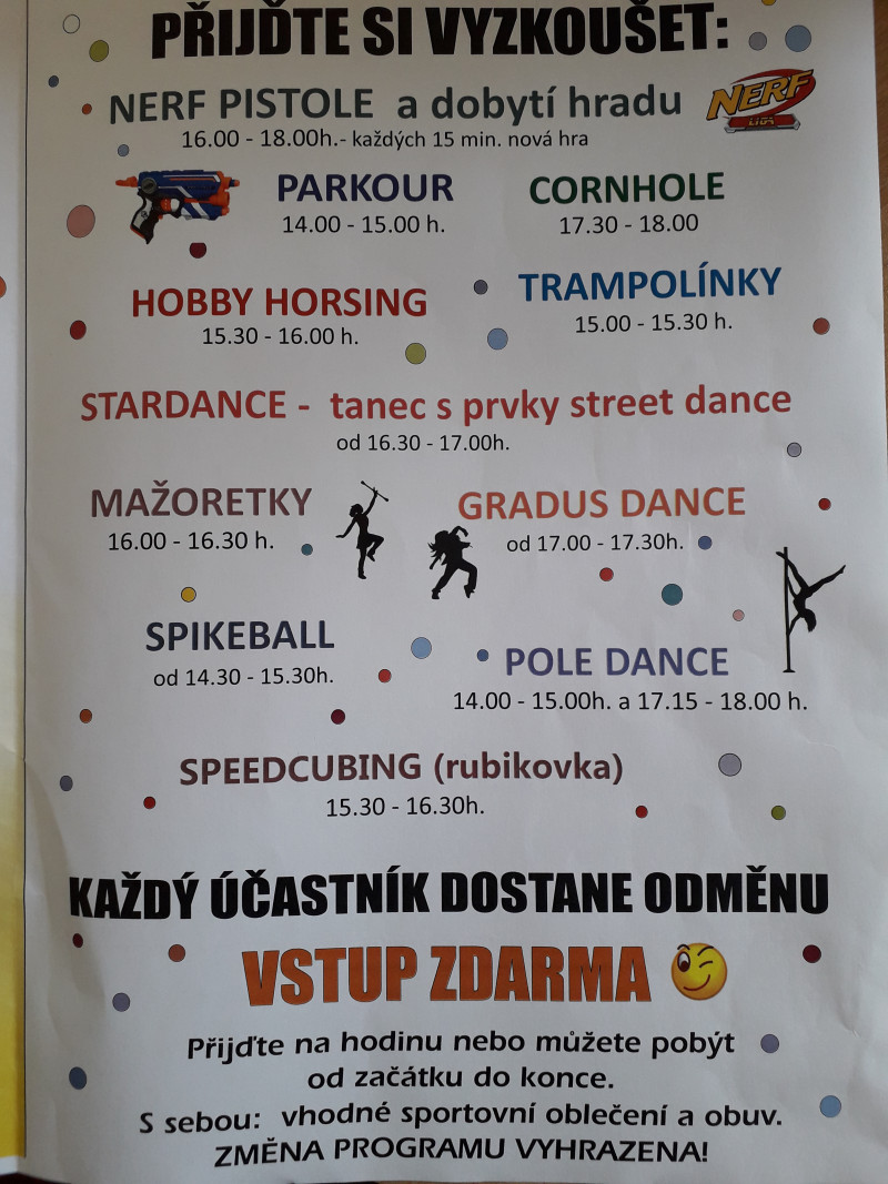 Dne 20. 10.2023 navštívíme s dětmi akci Fit děti v Domě dětí a mládeže. Odchod od školy v 13,45 h. Děti si můžete vyzvedávat i v průběhu programu v Domě dětí. Návrat do družiny v 15,00 h.