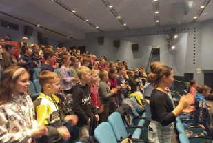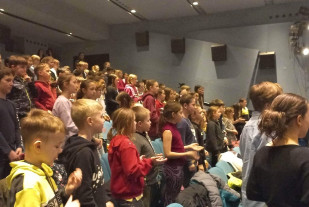 Z naší školy nás zastoupili všichni třeťáci a několik zpěvaček z 2. stupně. Učitelé HV pak spolu s dětskou kapelou rozezpívali a roztančili zaplněný kinosál. Na plátně se v průběhu akce objevovaly online záběry z různých míst ČR i Evropy.