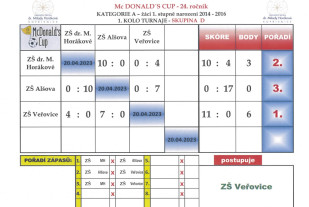 „Ve čtvrtek 20.04.2023 proběhlo na venkovním sportovišti naší školy 1. kolo fotbalového turnaje pod názvem ,,McDonald´s Cup 2023.“ Naši školu v kategorii ,,A“ (mladší žáci) reprezentovali žáci 1. – 3. ročníků.