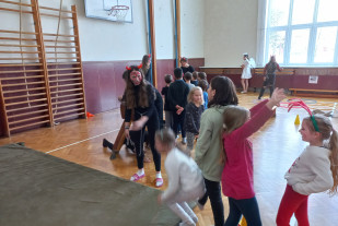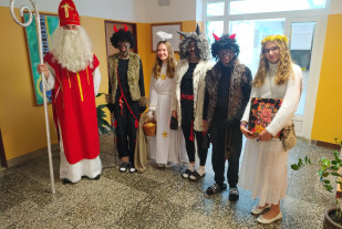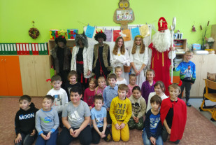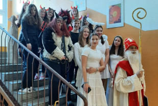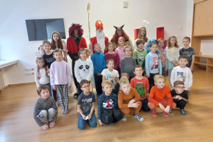 Připravili si krásné masky a malé odměny. Do dopolední akce se zapojilo 6 žáků z 9. C. Navštívili třídy zejména na 1. stupni. Mikuláš měl hříšníky zapsané ve své knize a ti museli říct básničku nebo zazpívat písničku. Společně si zatancovali čertovský tanec a všichni byli odměněni sladkostí.