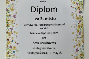 Naše žákyně 7.A,  Sofie Brukhovets, zaznamenala mimořádný úspěch v celostátním kole výtvarné soutěže - Máme rádi přírodu 2025, kterou v loňském školním roce uspořádalo Hnutí Brontosaurus.