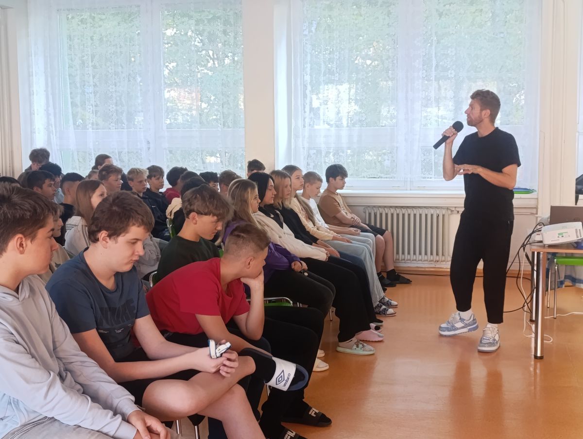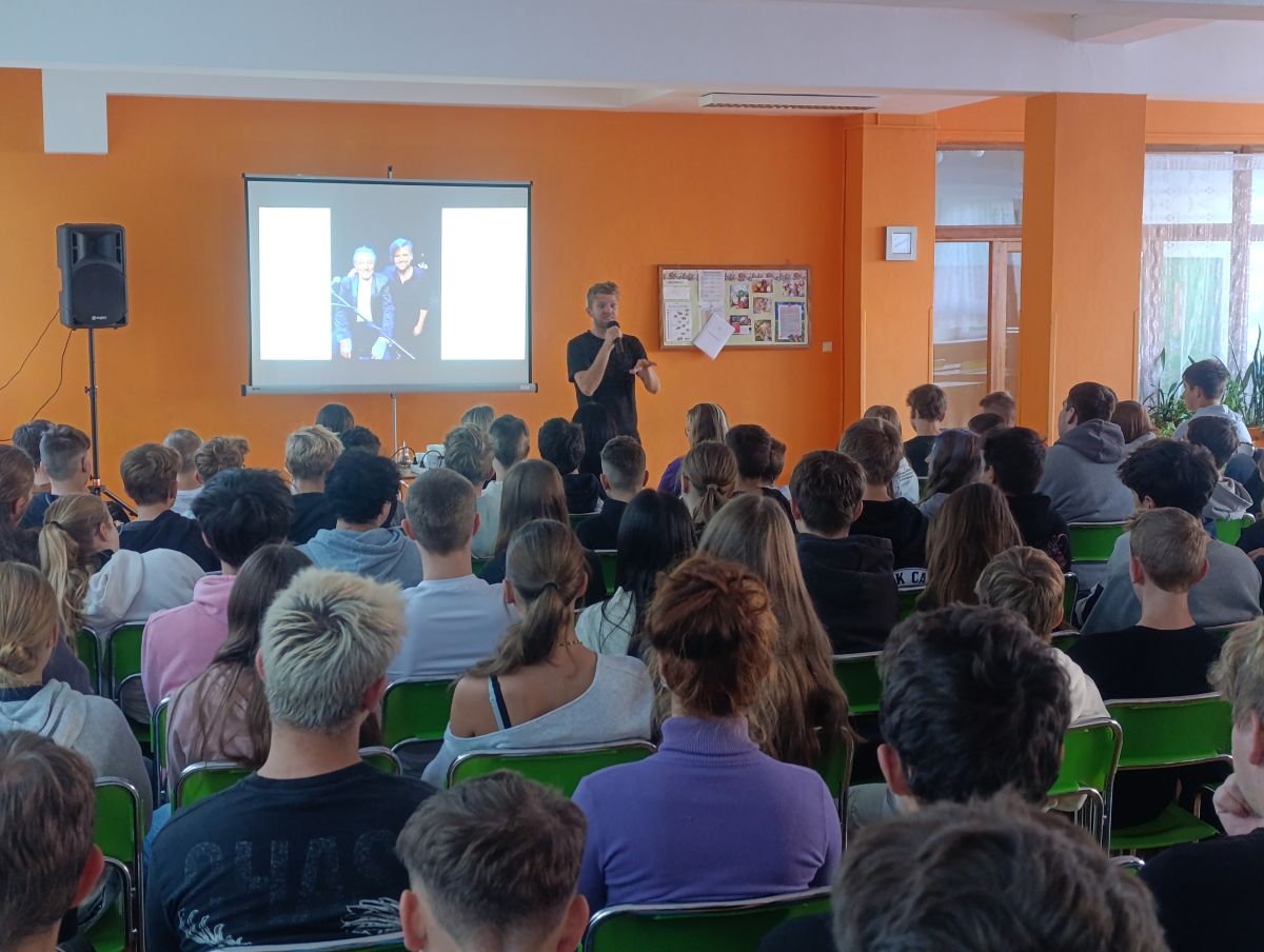 Petr Harazin žáky povzbudil, aby si vážili sami sebe a nebáli se říci NE, pokud by se ocitli
