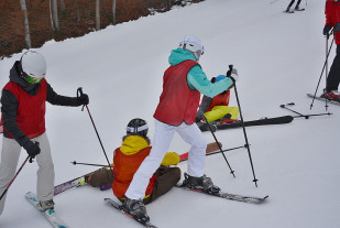 Skupina zdatnějších lyžařů tedy od začátku poznává ledové nástrahy modré sjezdovky a o pády není nouze. Padání probíhá napříč celým spektrem účastníků kurzu, nevyhnou se mu ani instruktoři. Opatrnost je na místě.