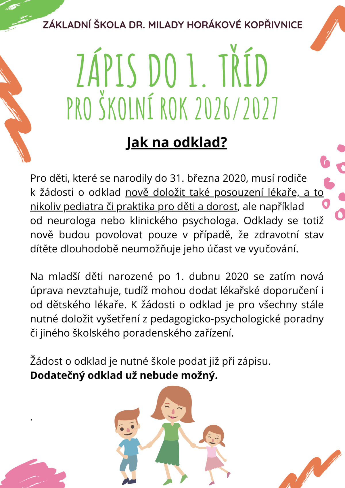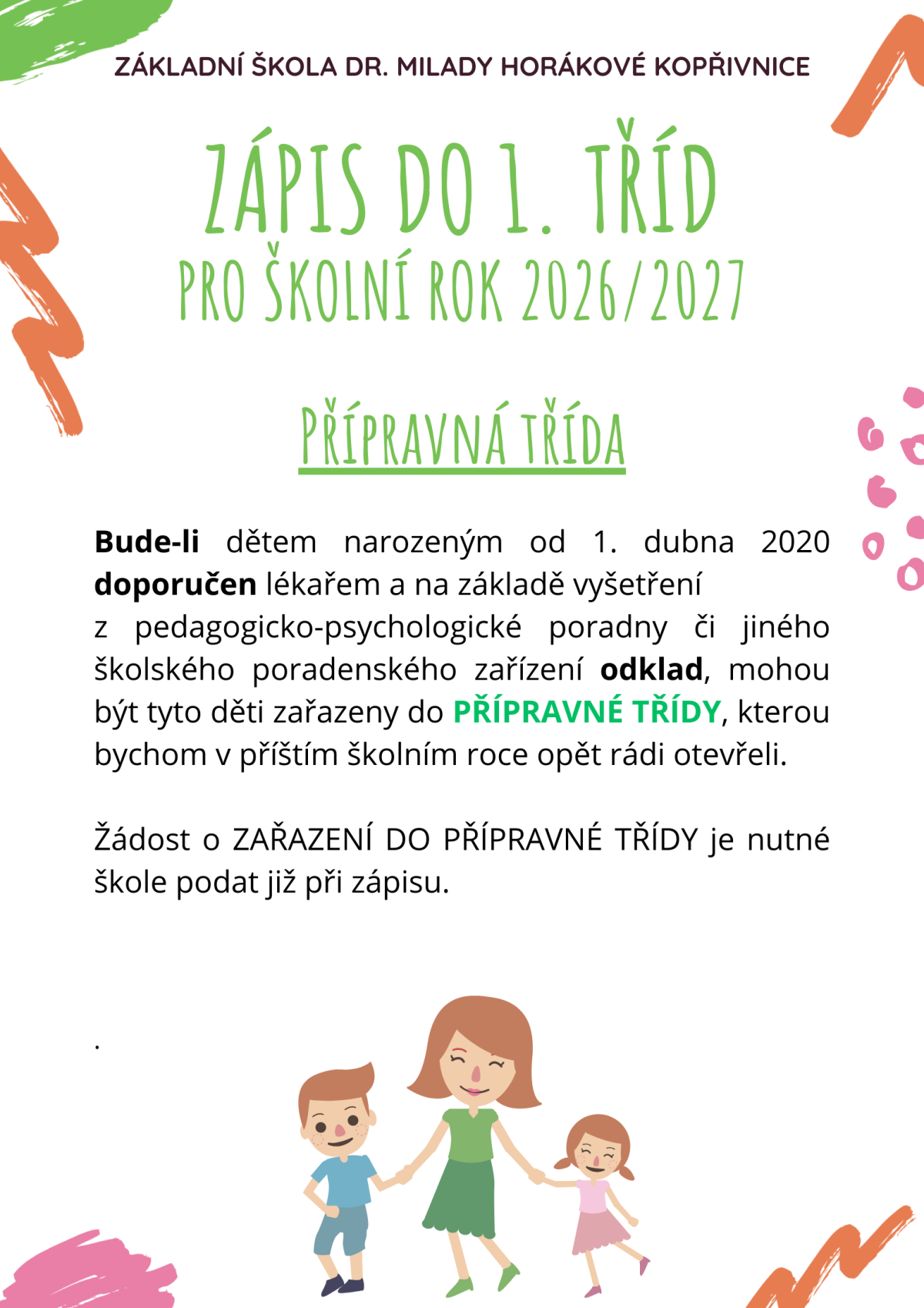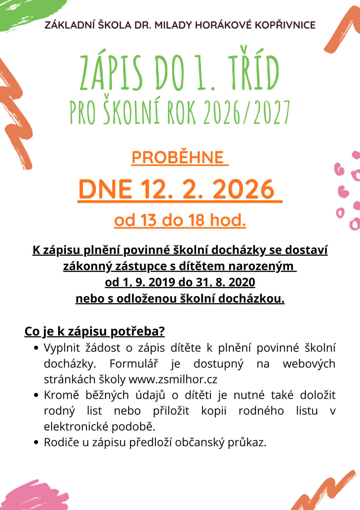 Vážení rodiče a zákonní zástupci, termín zápisu do 1. tříd je pro školní rok 2026/2027 stanoven na 12. února 2026. Více informací najdete v příloze.
